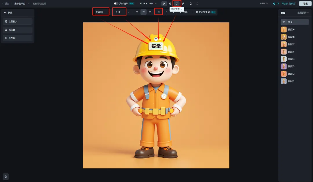 上传图片成功,点击【T】添加文字,选择字体类型、字体大小、字体颜色,将字体拖拽到安全帽的标志区域。