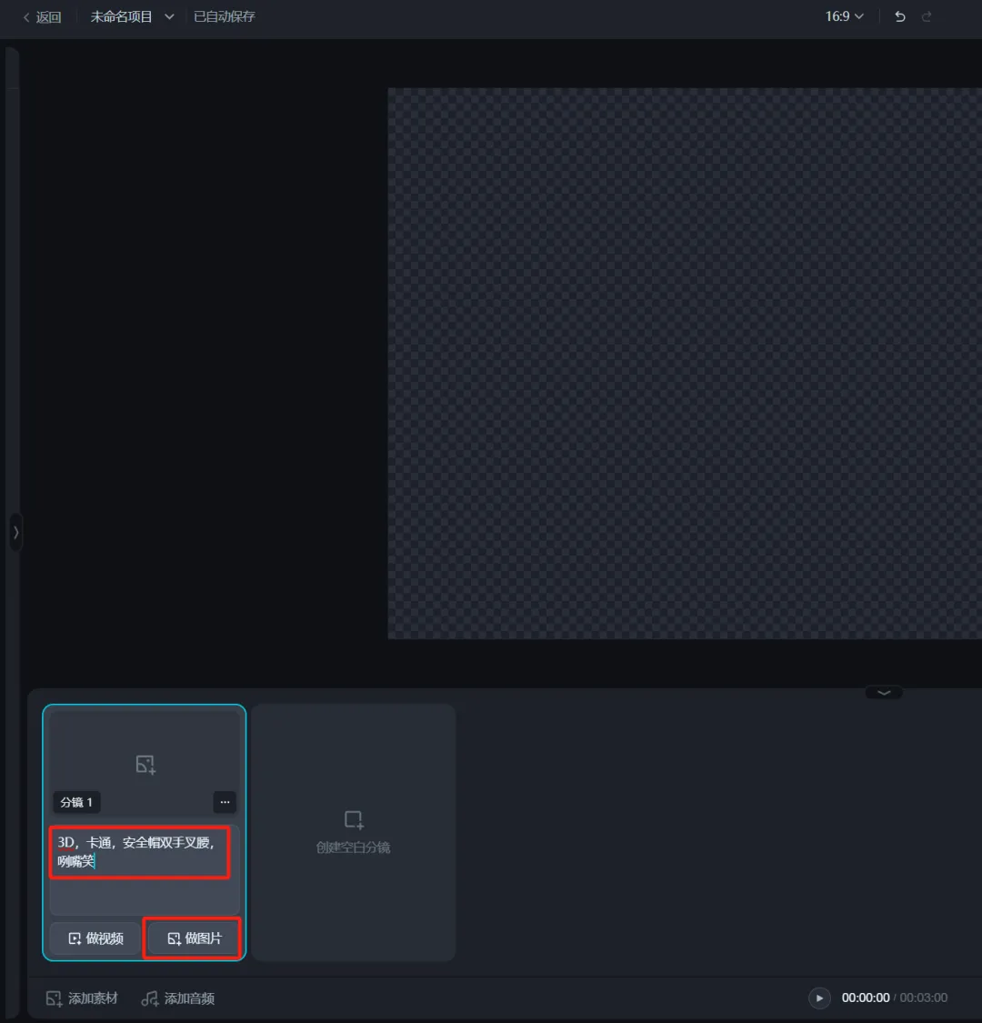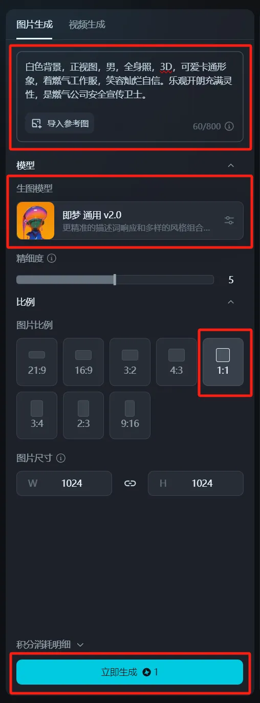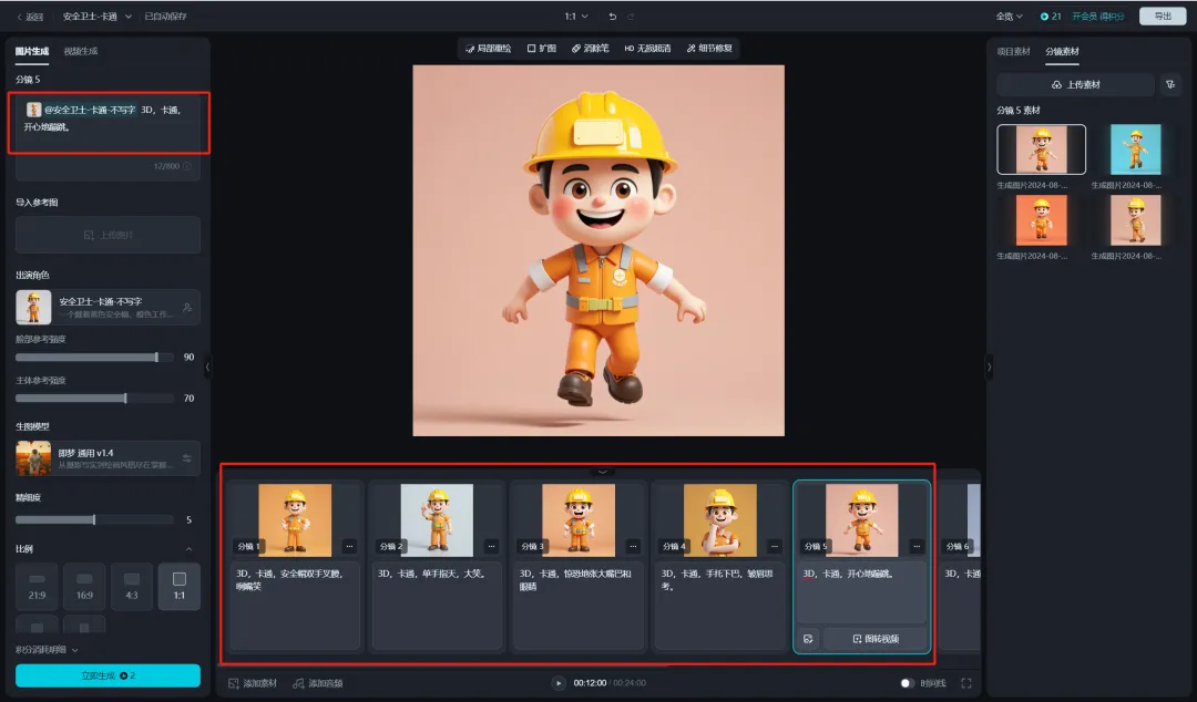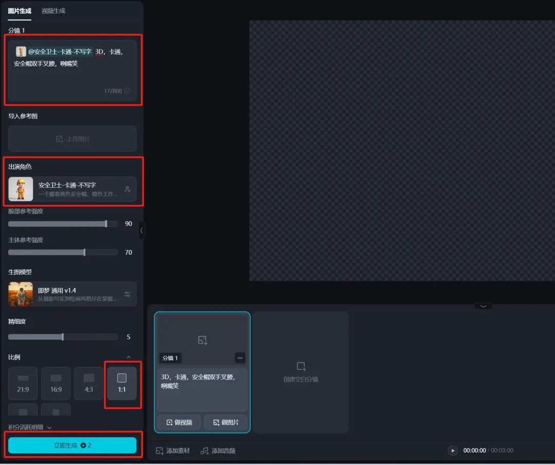 回到分镜图片生成页面,输入分镜描述,出演角色选择刚才创建好的角色,画面比例选择1:1,点击【立即生成】。