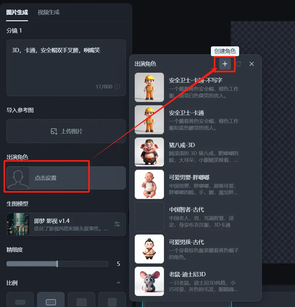 进入分镜图片生成页面,点击出演角色【点击设置】,然后再点击【+】创建角色。