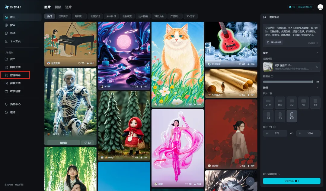 回到即梦官网主页,点击左边菜单【智能画布】。