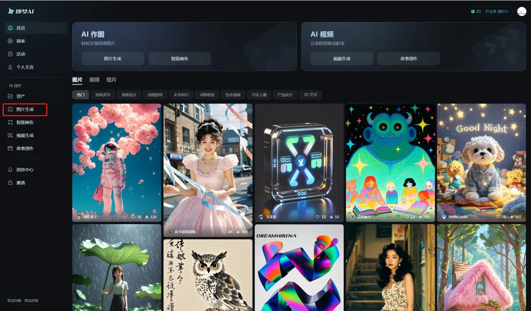 打开即梦官网主页(jimeng.jianying.com),点击左边菜单【图片生成】。