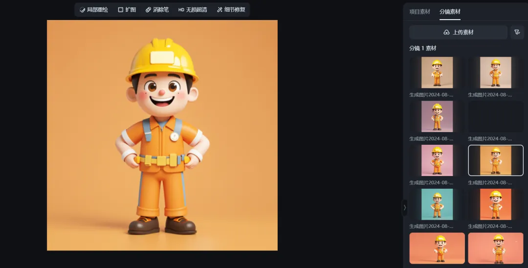 生成完成,每次生成四张图片,可从右侧分镜素材窗口选择最符合自己预期的图片作为素材图。若不满意可重新生成或者进行局部重绘、细节修复或部分消除。