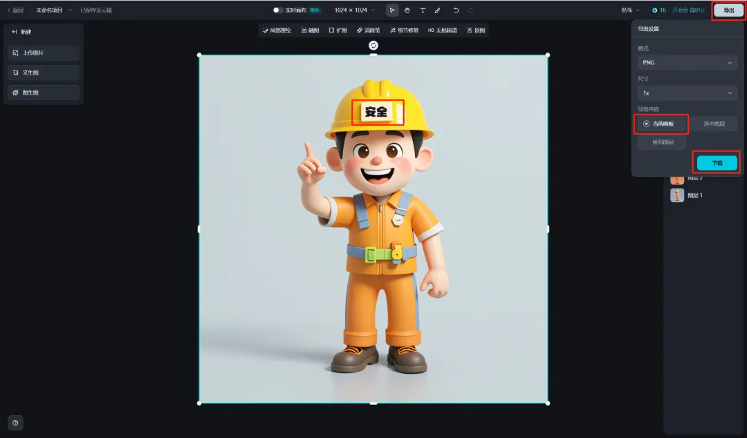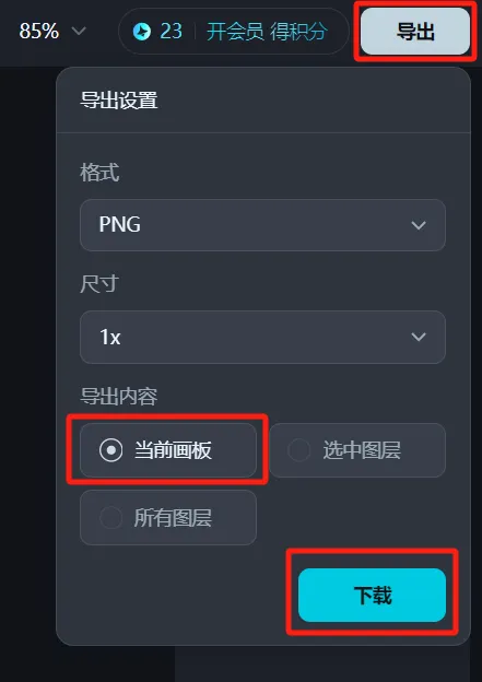 对此角色表示满意,点击右上角【导出】,选择当前画板,再点击【下载】。