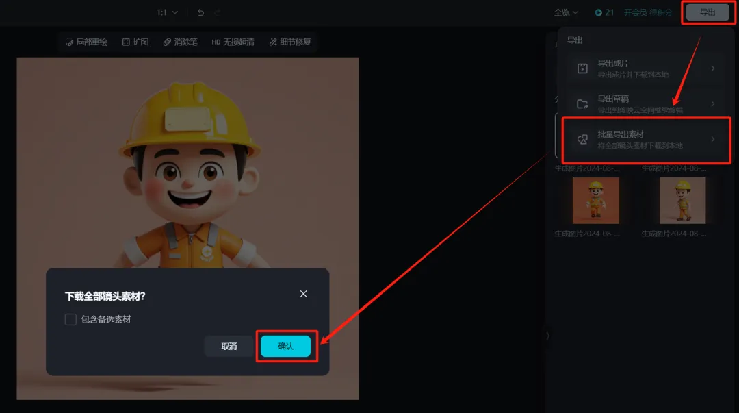 得到一批符合预期的分镜素材图片后,点击右上角【导出】——>【批量导出素材】——>【确认】。