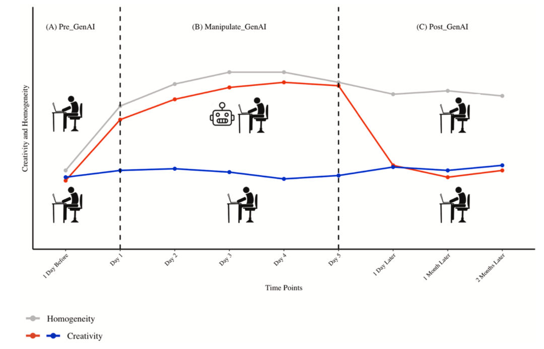研究团队结合断点回归设计与机器学习等技术,为我们揭示了生成式AI对个人创造力与群体同质性的长期且真实的影响。