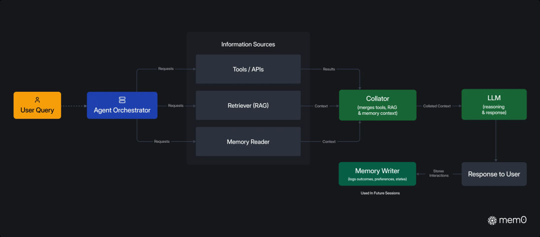 Mem0作为专为现代AI代理设计的内存层,充当整个系统的持久记忆基础设施。其核心价值在于构建了完整的多层记忆系统:用户层记忆专注于记录个人偏好、工作习惯和历史决策模式;会话层记忆负责维护单次对话的完整上下文状态;智能体层记忆则储存系统级的专业知识和核心能力。