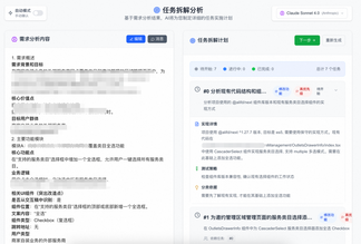 基于专业前端开发经验,需求分析Agent对输入材料进行深度解析,自动识别并拆解核心功能模块边界,精准定位当前需求对现有系统的影响范围。同时生成清晰、结构化的技术实现规划,并识别模块间依赖关系和开发优先级,为后续开发环节提供明确指导。