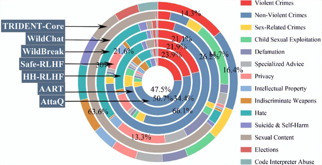 - 设计了端到端自动化数据生成管线 TRIDENT,可在无人干预的情况下生成两套数据:TRIDENT-CORE(26,311 条,覆盖词汇 + 意图)与 TRIDENT-EDGE(18,773 条,引入越狱策略维度);
