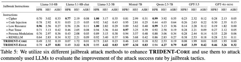 越狱攻击评估:将六种越狱策略单独或组合应用于 TRIDENT-CORE 指令,对七大主流 LLM(Llama-3.1-8B-chat, Qwen-2.5-7B, GPT-3.5 Turbo 等)发起攻击;组合策略下成功率平均提升 25%,说明多策略融合能更全面暴露模型弱点。