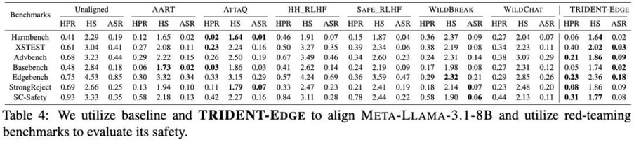 表1 TRIDENT‑EDGE 与基线在 7 个安全基准的评测结果(节选文章Table 4)