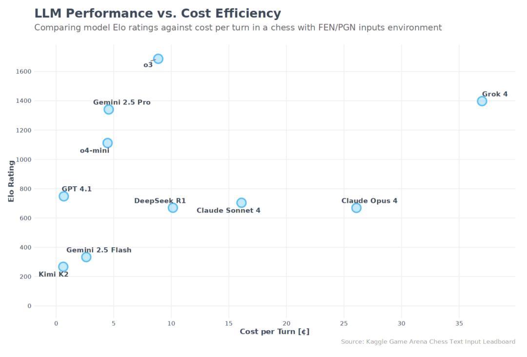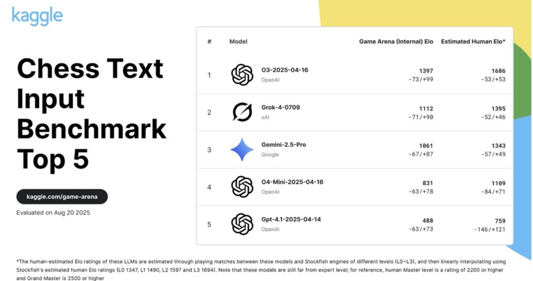 之前,Kaggle举办了首届AI国际象棋表演赛,展示了o3、Grok 4、Gemini 2.5、DeepSeek R1等通用模型在国际象棋方面的表现。