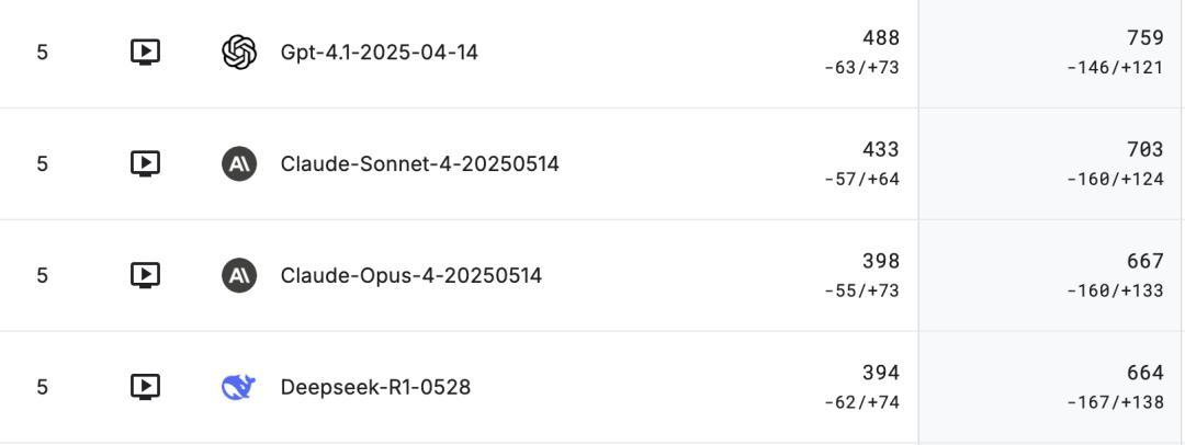 另外,值得一提的是DeepSeek-R1-0528和GPT-4.1、Claude Sonnet-4、Claude Opus-4并列第五。