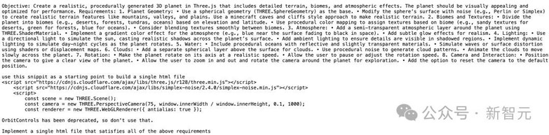 网友Peter Gostev发现该模型后,使用提示词「要求模型使用Three.js创建一个程序生成的星球」。