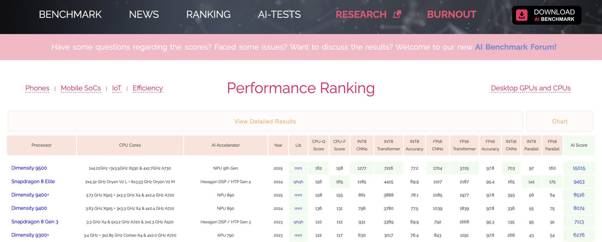根据榜单数据,当前同类旗舰手机芯片的成绩通常在8000-9000分左右,天玑9500 AI性能的提升是十分可观的,连续数年持续霸榜,天玑在推动端侧 AI 落地上的决心和投入可见一斑。