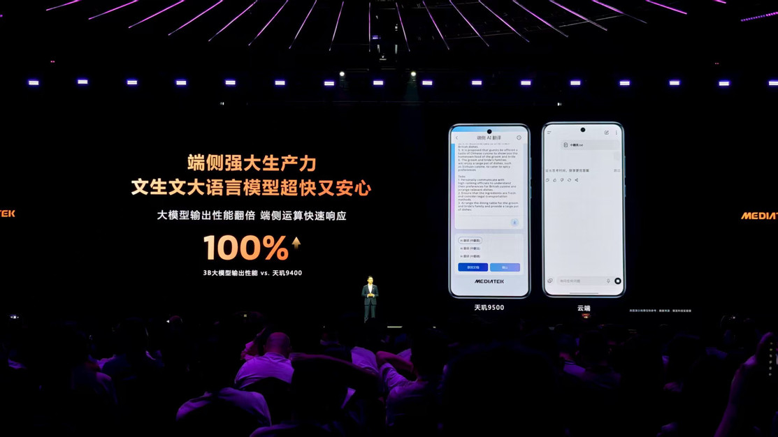 比如在现场我们看到,基于双NPU架构带来的性能和能效提升,天玑9500加持的手机终端可以实现端侧长文本处理,文本支持长度增长了3倍,最高支持128K文本输入。