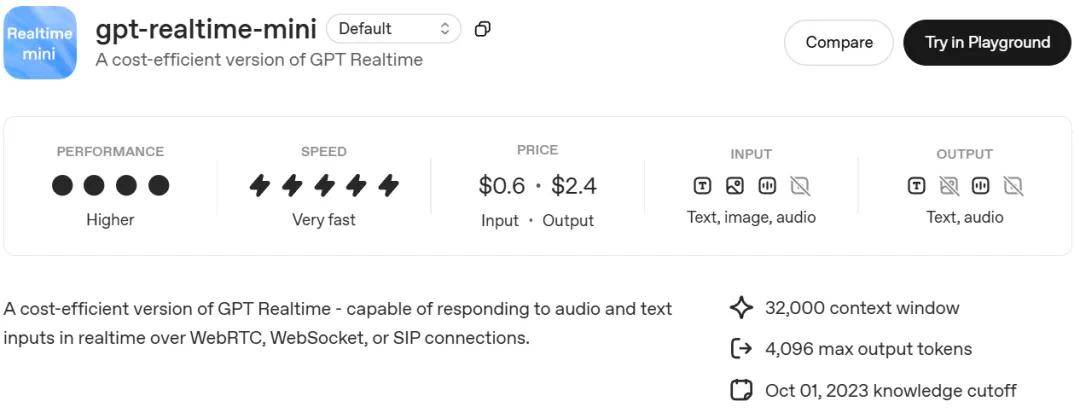 OpenAI 还发布了一个 GPT Realtime 的 mini 版本,可通过 WebRTC、WebSocket 或 SIP 连接实时响应音频和文本输入。以下截图展示了其一些参数和定价信息: