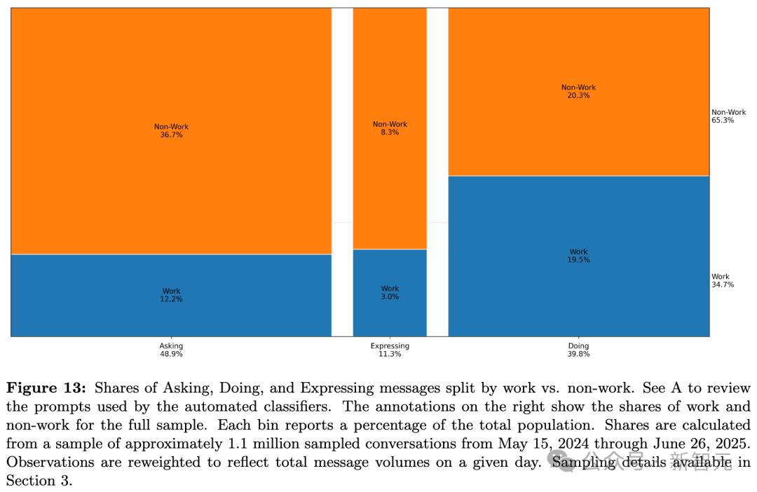 下图中,是110万条抽样对话,提问、执行和表达使用情况,在工作非工作类中的占比。