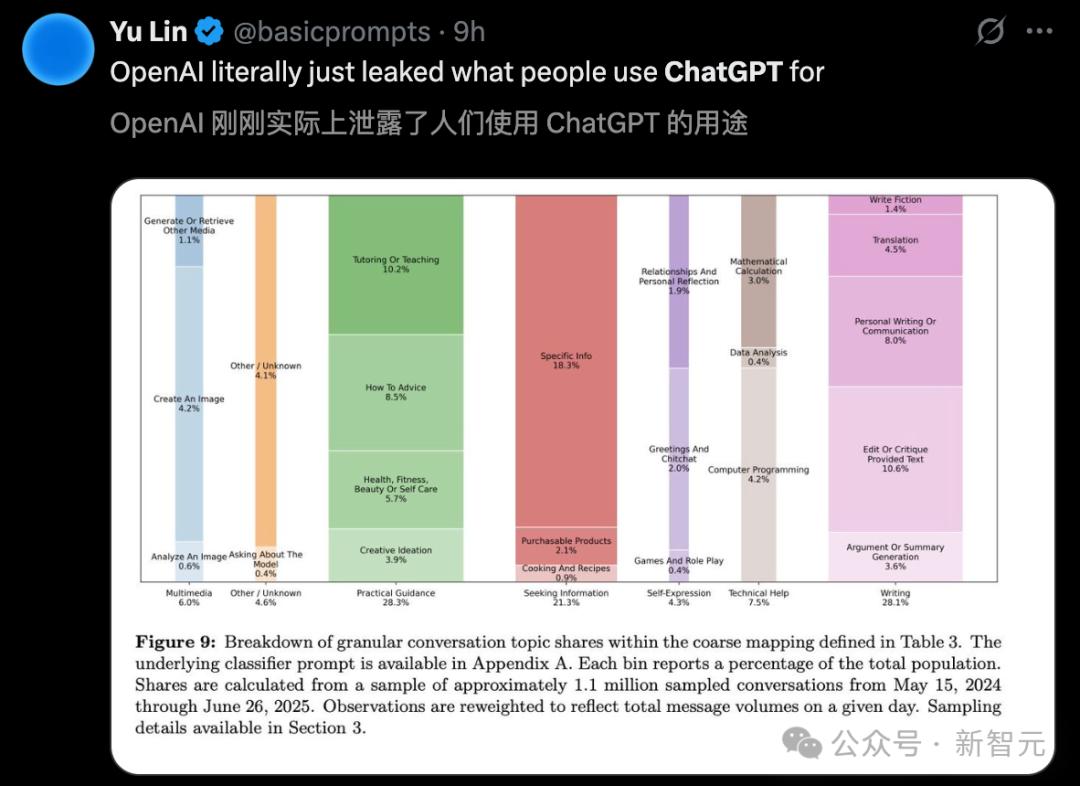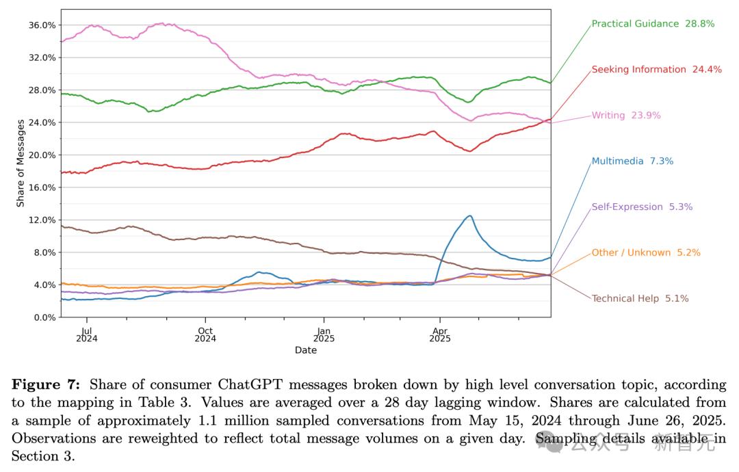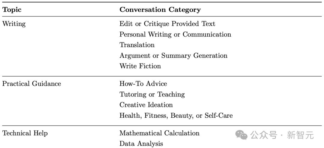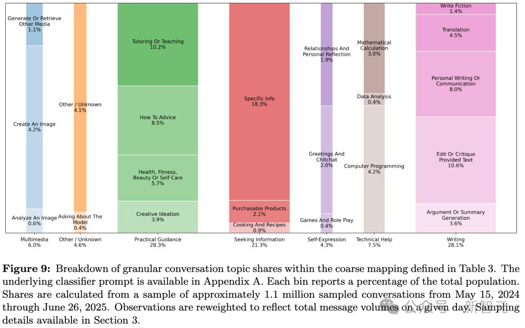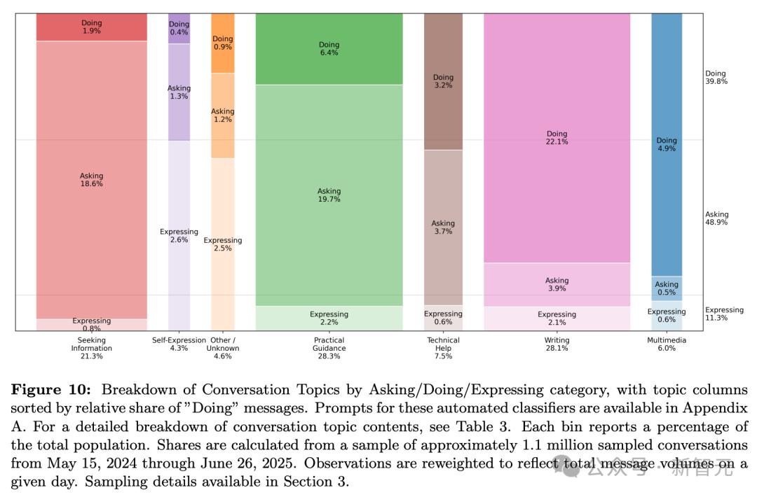 其中,实用建议、信息查询、文书写作,是最常见的三大主题,占对话80%。