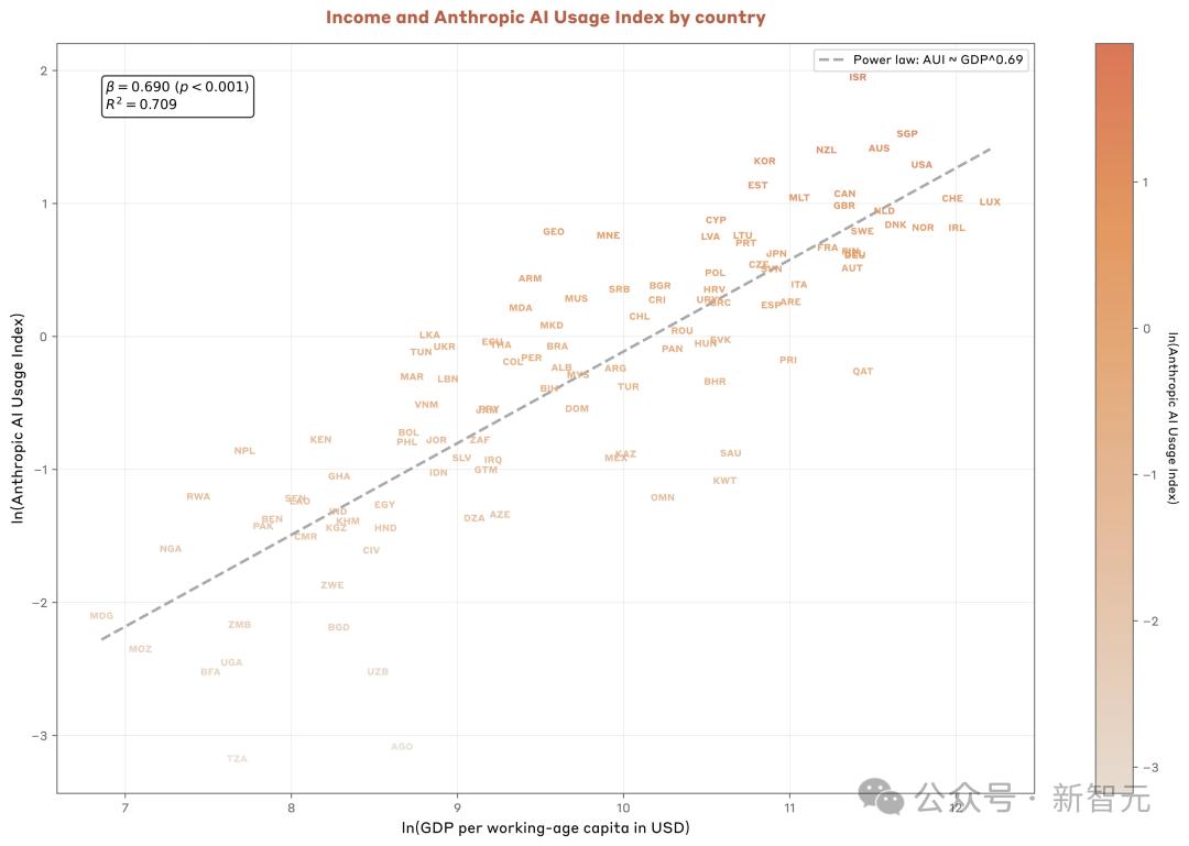 这在很大程度上可以用收入水平来解释:人均GDP与Anthropic AI使用指数之间存在很强的正相关性(人均GDP每高1%,AUI相应高出0.7%)。