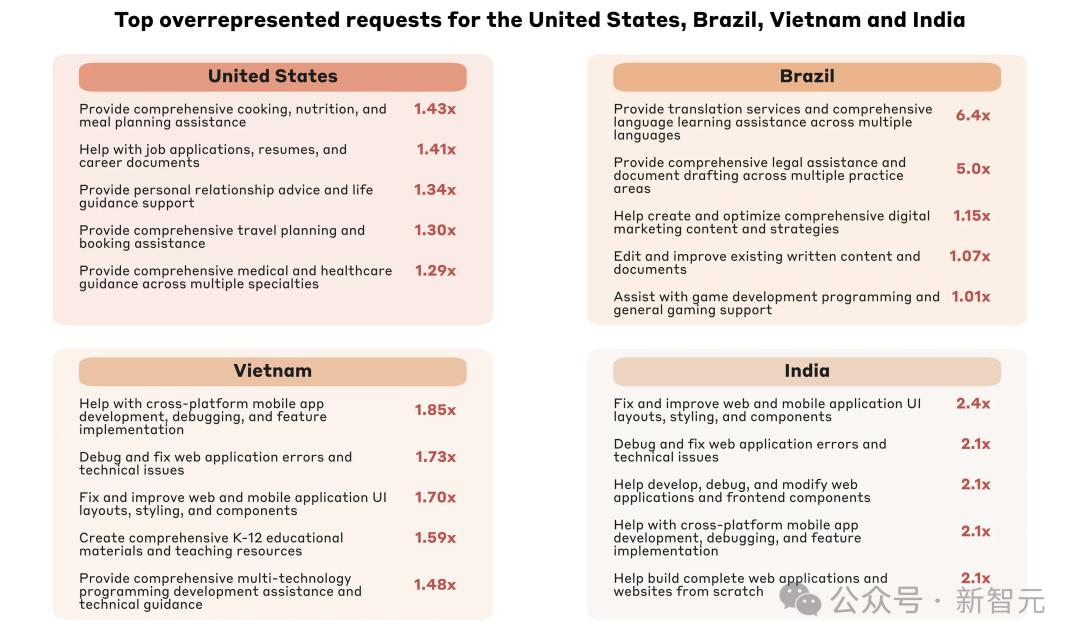 - 巴西用户则对语言学习情有独钟,他们使用Claude进行翻译和语言学习的频率,达到了全球平均水平的6倍!