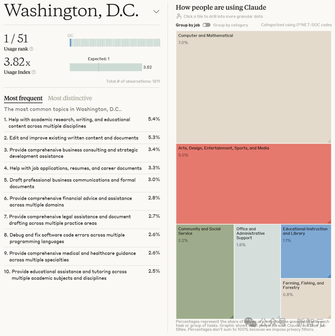 全美AUI指数最高的地区是哥伦比亚特区(3.82),在这里,人们最爱让Claude做的,是编辑文档、搜索信息这类典型的「白领」工作。