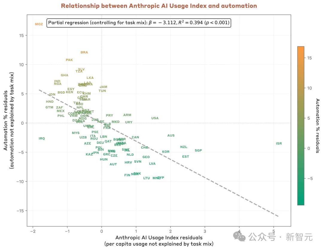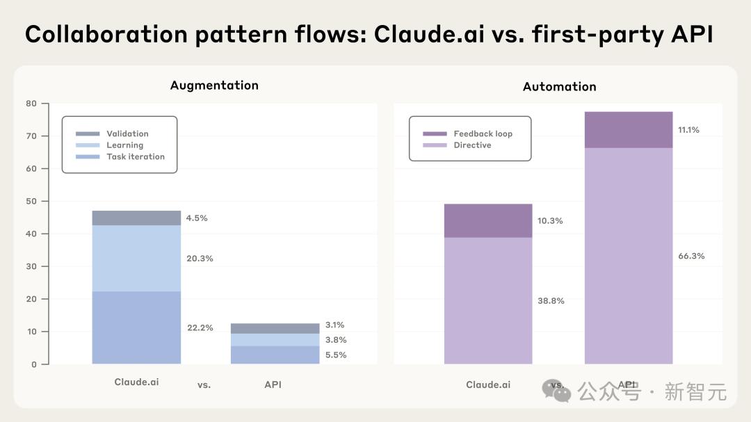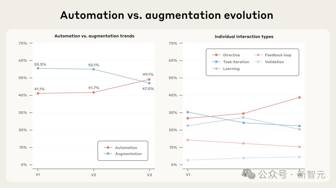 除此之外,报告中还有一个颇为反直觉的发现:Claude使用量每增加1%,自动化任务的比例就相应减少约3%。