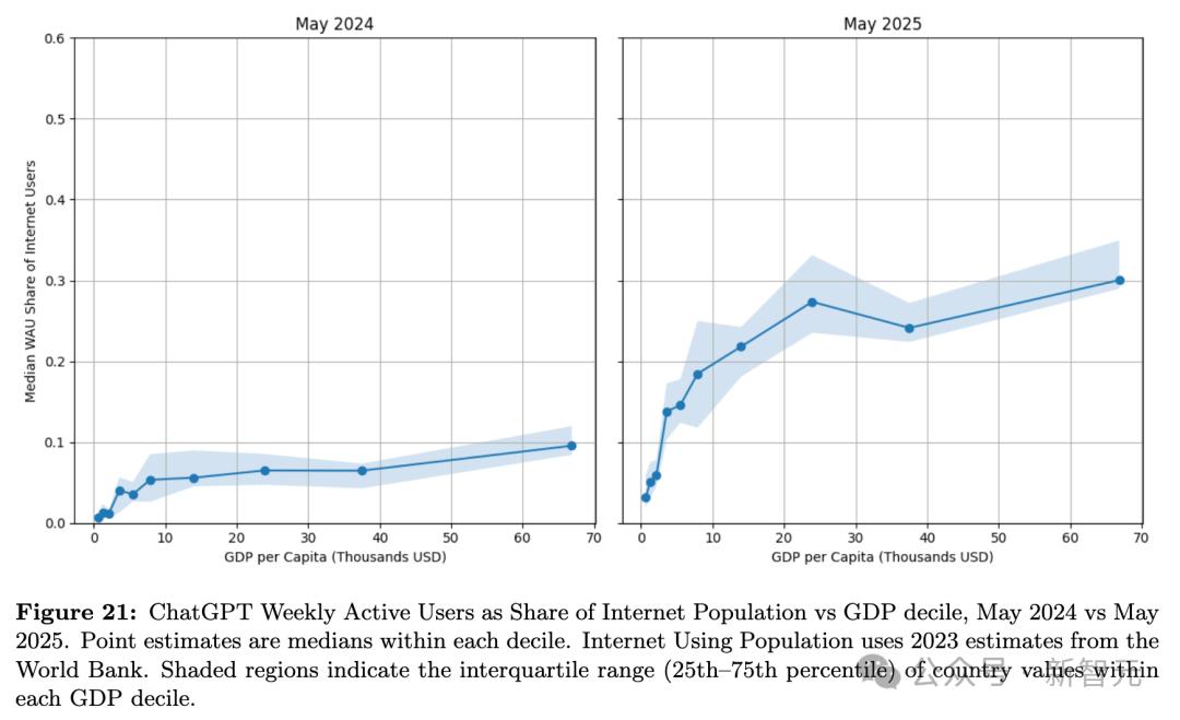 在中低收入地区(人均GDP介于1万至4万美元之间)中,ChatGPT使用率迅速增长。