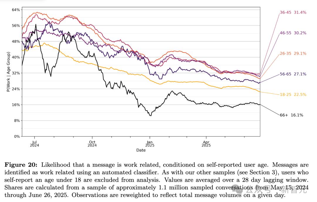 总言之,所有年龄段的用户对ChatGPT的使用,均呈现出工作相关用途逐渐减少的演变特征。