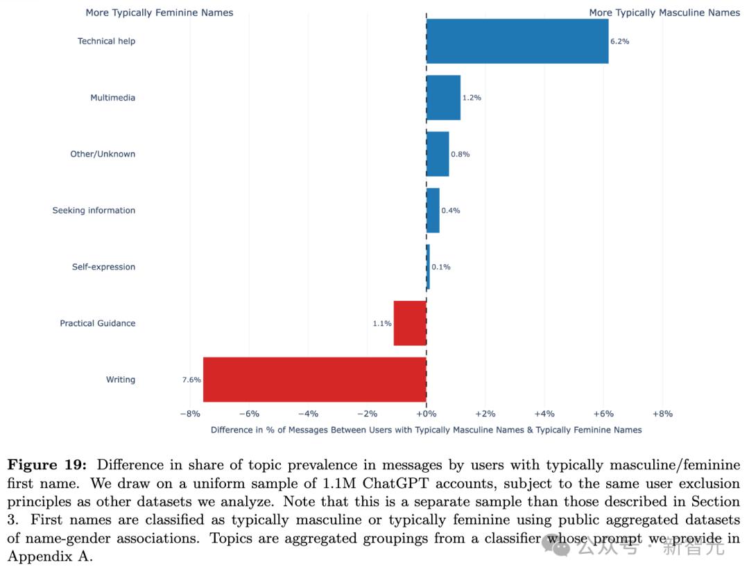 女性ChatGPT用户,更倾向于写作、实用指导相关的任务;男性用户则更频繁地获取技术帮助、信息查询、多媒体服务。