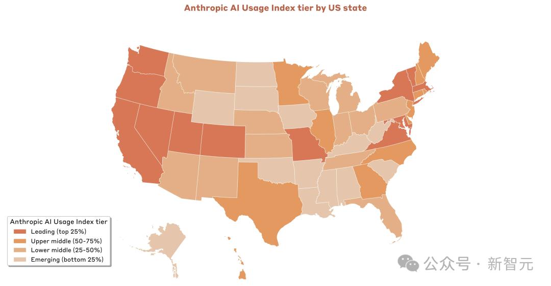 - 首次详细描绘了美国各州的使用情况:一个州的经济结构,决定了其人均Claude使用量。令人意外的是,使用强度最高的州,并不是「码农大本营」。