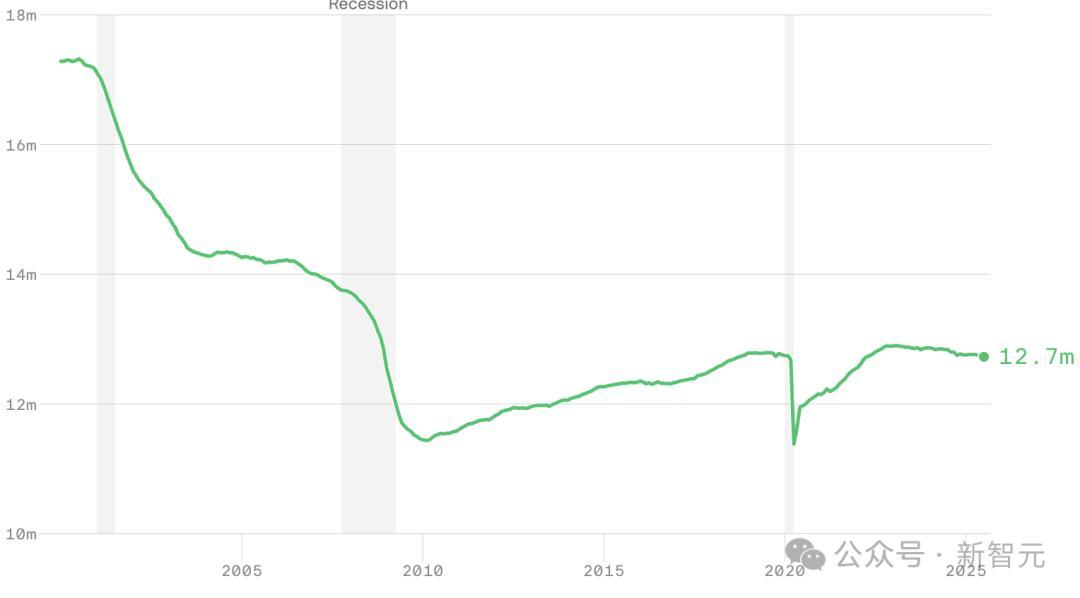 不过,这一趋势并不是持续线性下降。相反,在2001年和2008年的两次经济衰退及其后几年里,就业人数出现了明显下滑,而在这两次之间的年份中,制造业就业则相对稳定。