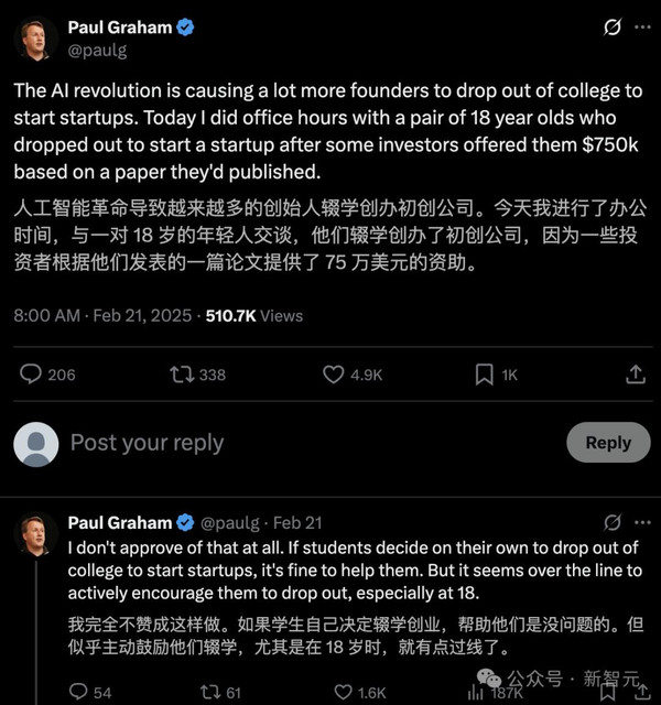 社交媒体上,AI辍学标签「#AI Dropout」下的帖子疯传,一条高赞推文写道:「最聪明的一代人正在离校,以正面引导AGI的诞生。」