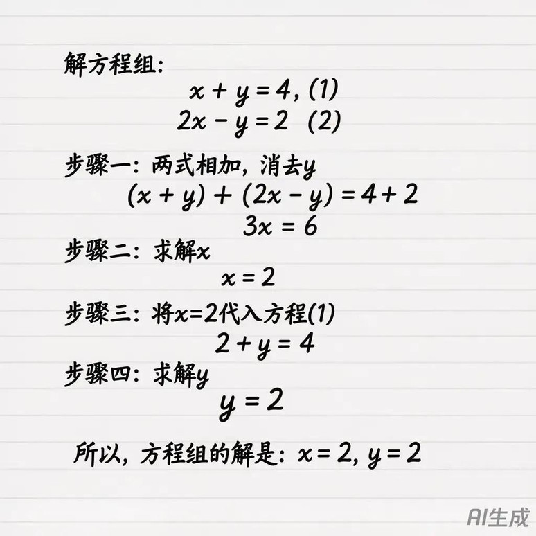 提示语:解方程组 x+y=4 ,2x-y=2,给出详细求解过程。