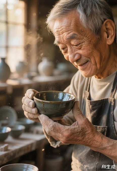 「A photorealistic close-up portrait of an elderly Japanese ceramicist with deep, sun-etched wrinkles and a warm, knowing smile. He is carefully inspecting a freshly glazed tea bowl. The setting is his rustic, sun-drenched workshop. The scene is illuminated by soft, golden hour light streaming through a window, highlighting the fine texture of the clay. Captured with an 85mm portrait lens, resulting in a soft, blurred background (bokeh). The overall mood is serene and masterful. Vertical portrait orientation.」