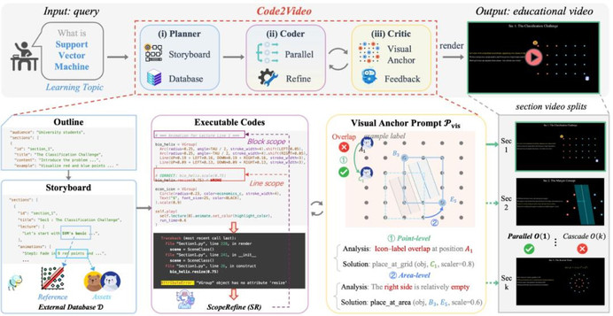 - 鉴赏家(Critic)——利用多模态模型(VLM)反馈与视觉锚点提示(Visual Anchor Prompt)对生成的教学视频进行修正,避免元素遮挡、位置错乱,保证画面层次清晰、讲解可读。