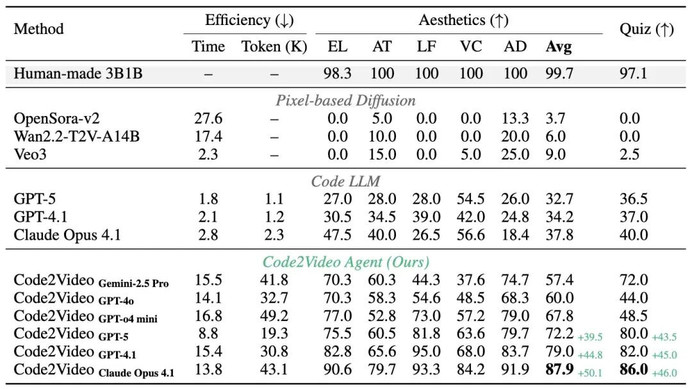 - 代码范式有效:直接使用 Code LLM 生成 Manim 代码并渲染视频的新范式,相比基于像素空间的视频生成方法在 TeachQuiz 指标上平均提升约 30%;
