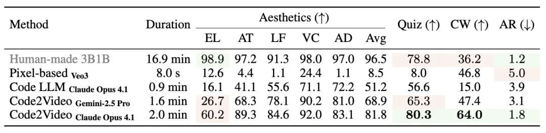 - 注意力限制:专业制作的教学视频存在因时长过长,受试者常跳过片段,导致 TeachQuiz 得分降低的情况;而 Code2Video 生成的短视频更契合受试者注意力范围;