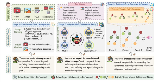 与传统音频生成模型需要大量训练数据不同,AudioGenie采用创新的无训练多智能体框架,通过双层架构(生成团队与监督团队)实现高效协同。生成团队通过细粒度任务分解和自适应专家混合(MoE)机制,动态选择最适合的模型进行音频生成,确保输出质量。监督团队则负责时空一致性验证,并通过反馈循环进行自我纠错,确保生成的音频高度可靠。这一设计彻底消除了对大规模配对数据集的依赖,极大降低了开发成本,同时提升了生成效率。