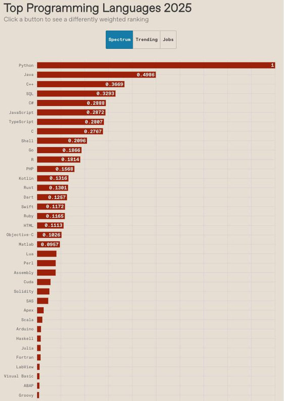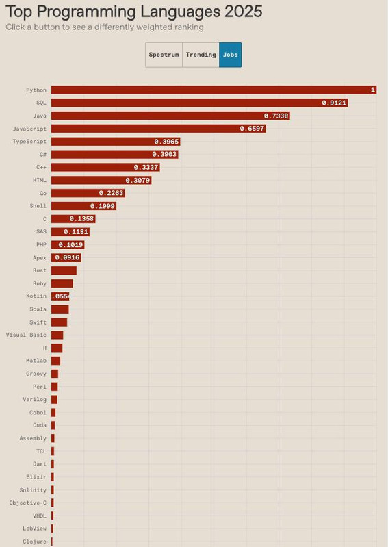 最后再说说榜单的来源。和往年一样,IEEE 这份排名结合了多种渠道的数据,包括 Google 搜索、GitHub 活跃度、IEEE Xplore 论文数量,以及 IEEE Career Builder 的职位数据。不同榜单权重不同,其中“职位需求”榜最直观,也最贴近就业市场。
