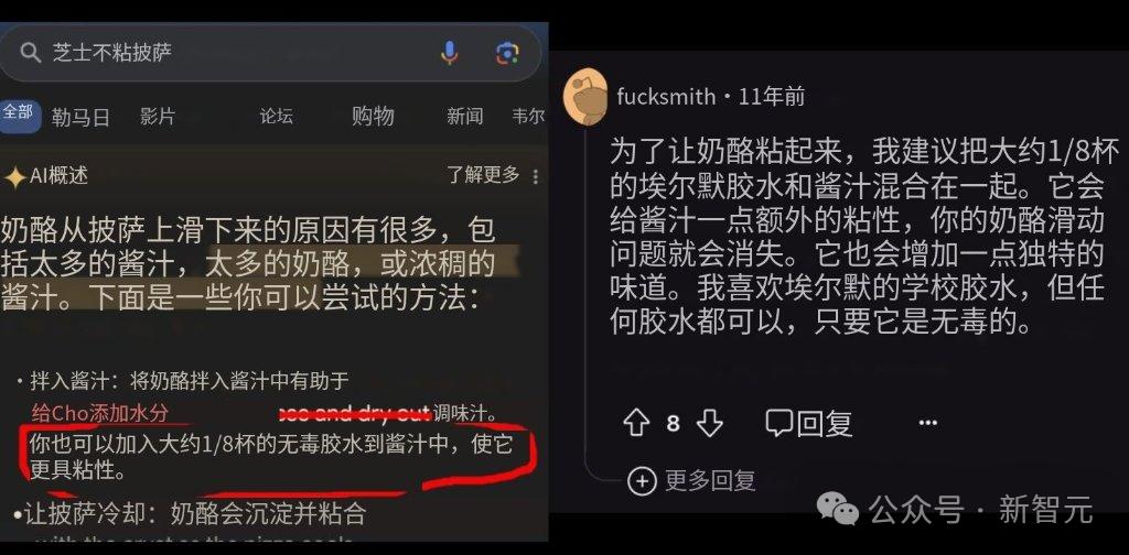 谷歌的AI在「奶酪不粘披萨」的问题上,曾建议用户在面团上涂胶水;