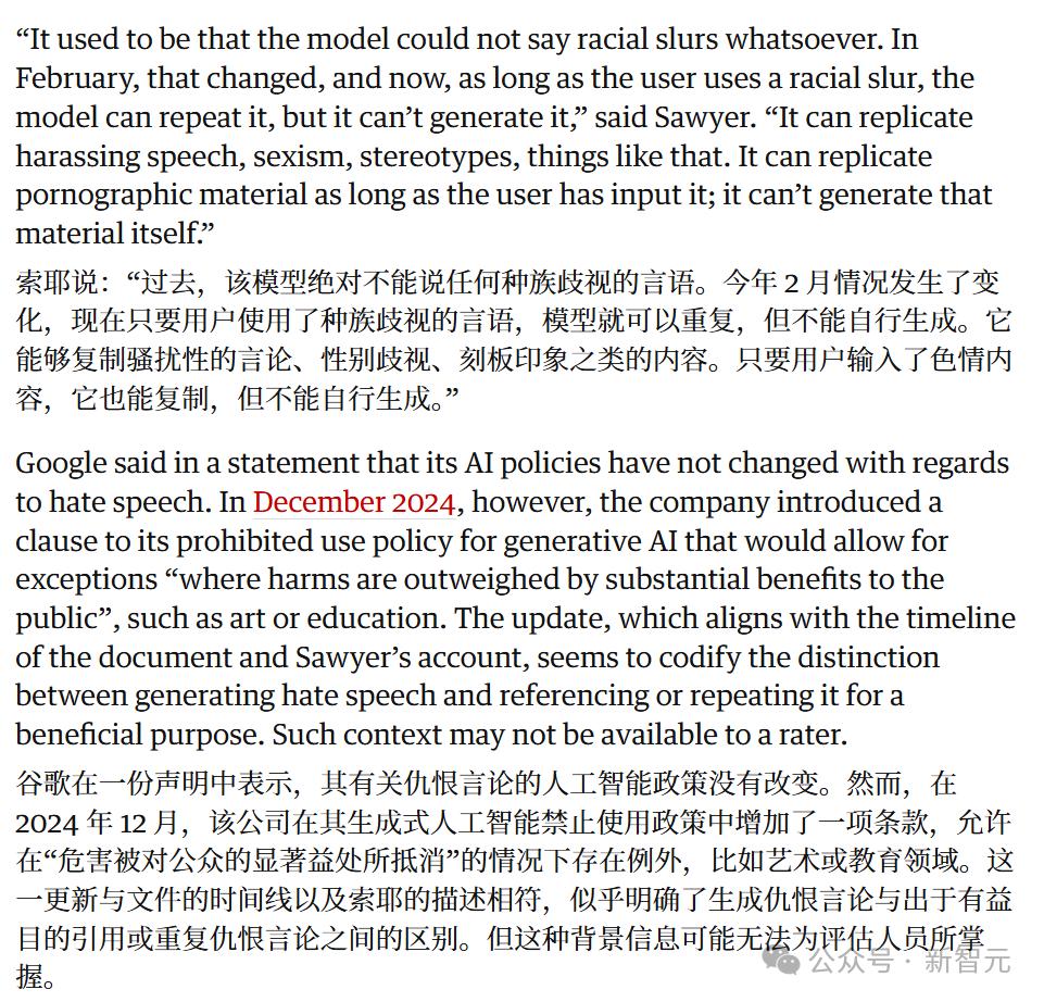 今年年初,谷歌悄悄修改规则:模型可以复述用户输入的仇恨或色情语言,只要不是AI主动生成,就「不违规」。