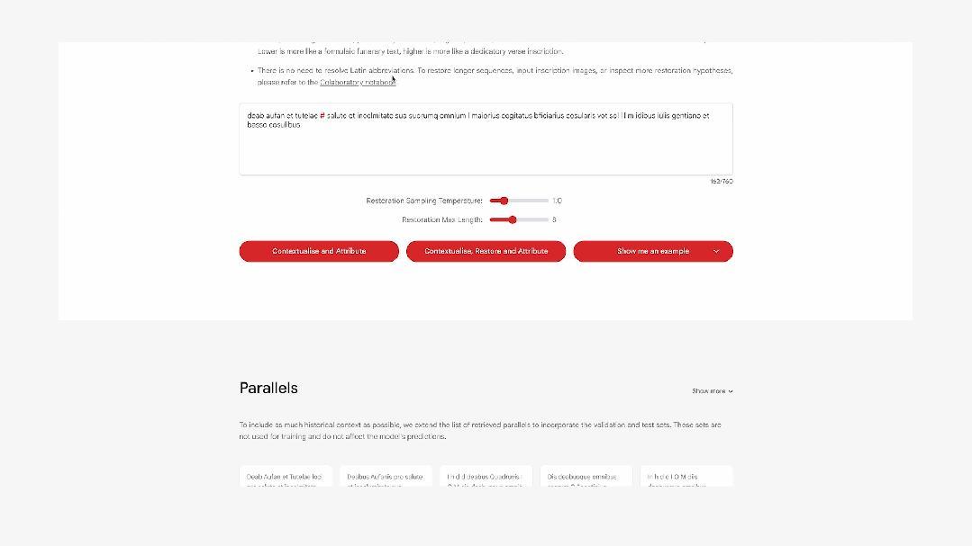对于每块铭文,Aeneas的语境化机制使用一种称为嵌入的技术检索一系列相似物——将每块铭文的文本和语境信息编码成一种包含文本内容、语言、来源时间地点以及与其他碑文关联性的历史指纹。