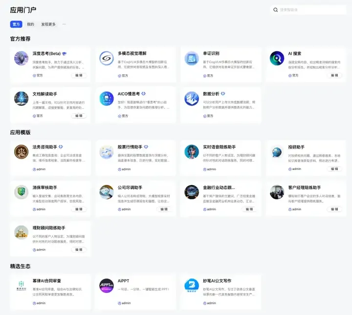 在应用门户界面,集中了官方精品应用、应用模版和精选生态。企业也可以自主开发和接入外部智能体应用。