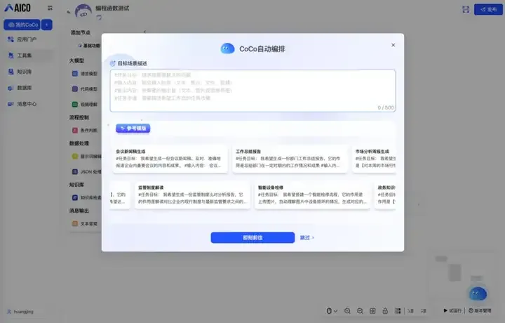 从CoCo产品界面来看,用户仅需明确任务目标、定义输入输出格式及关键步骤,通过简单的目标场景描述便能智能自动生成工作流草稿,并在画布上完成节点间逻辑连线,直观呈现流程。