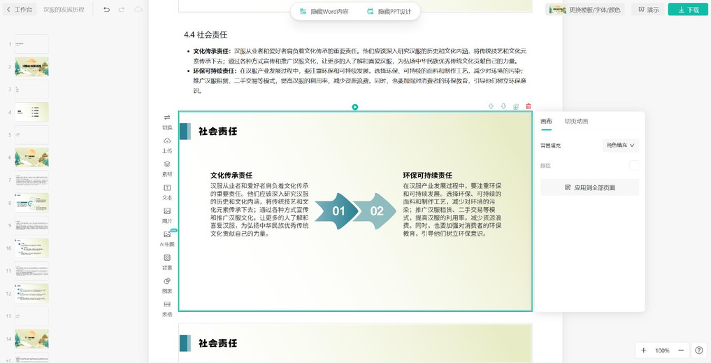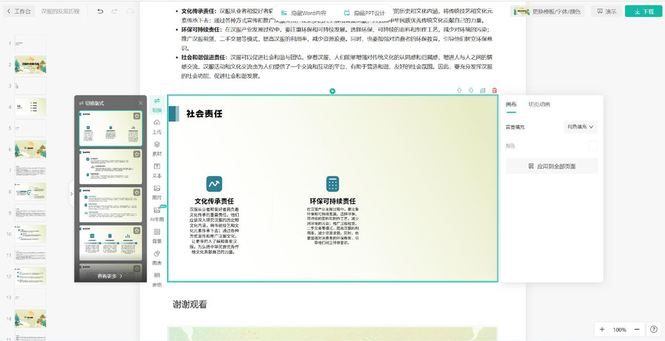 同时,编辑页面支持一键优化文案、AI生成图片、图表美化等功能,制作专业PPT变得轻松又高效。