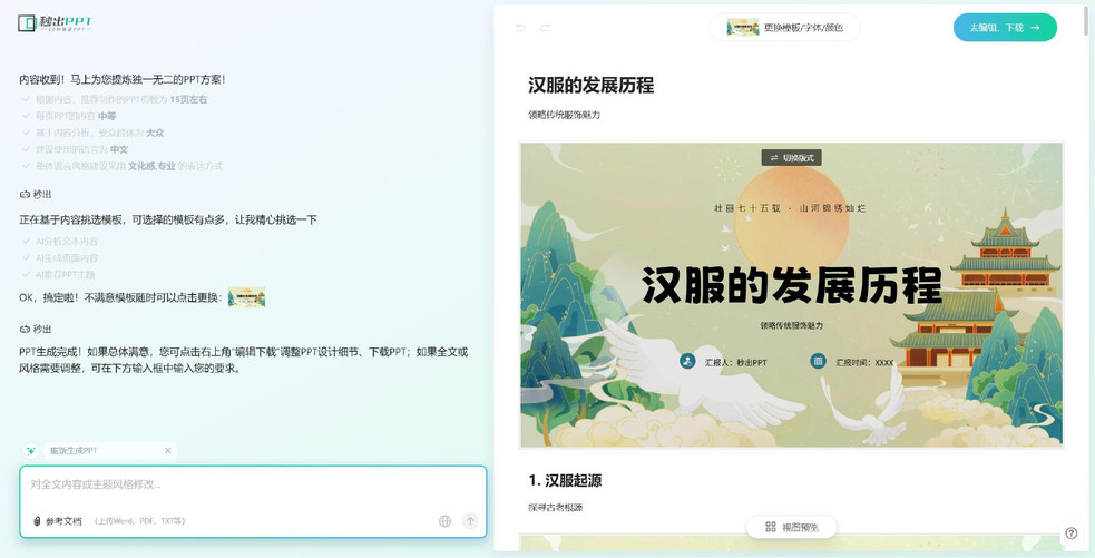 秒出PPT采用左右分屏:左侧为AI对话区域,右侧为PPT预览区。用户可以在左侧直接修改内容,AI会实时调整右侧排版。