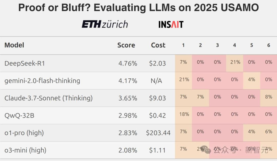 当时他们发现,在美国数学奥赛上,顶级AI模型得分不足5%,当时的DeepSeek-R1还是冠军来着,得分4.76%。