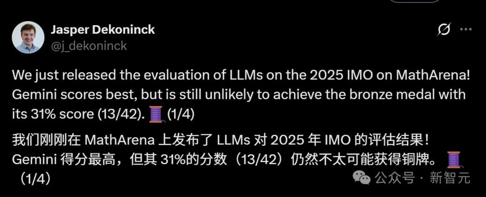 【新智元导读】AI做奥数的神话,刚刚被戳破了!最新出炉的2025 IMO数学竞赛中,全球顶尖AI模型无一例外翻车了。即便是冠军Gemini也只拿下可怜的31分,连铜牌都摸不到。Grok-4更是摆烂到底,连DeepSeek-R1都令人失望。看来,AI想挑战人类奥数大神,还为时尚早。