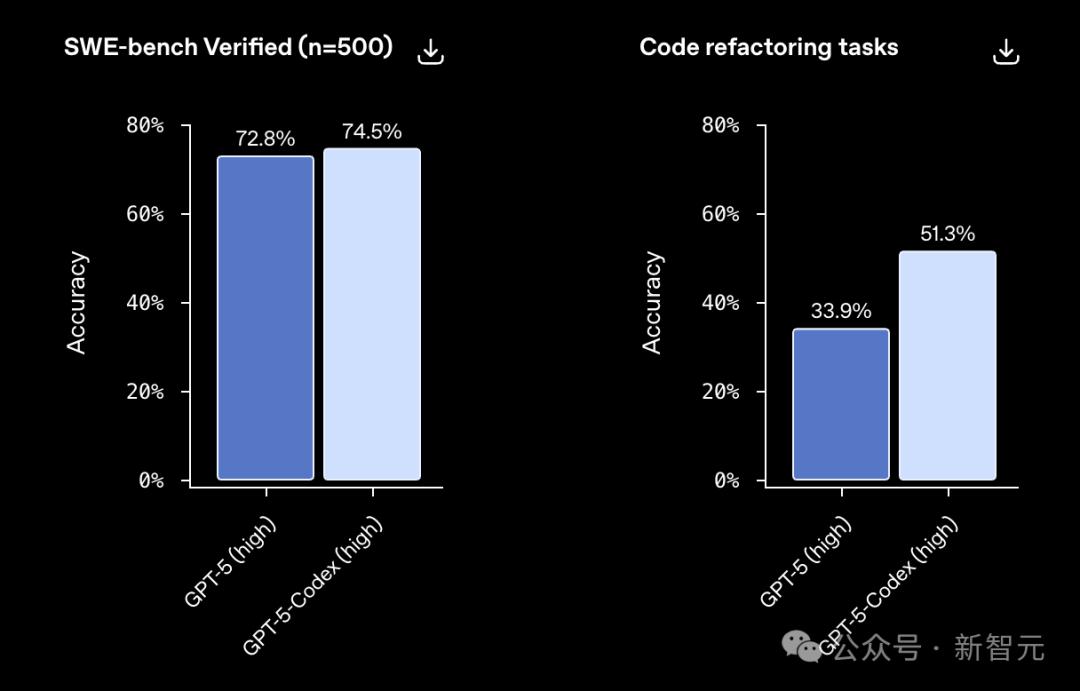 尤其是在非常适合于真实世界任务的代码重构任务上,GPT-5-Codex的准确率达到了51.3%,远高于GPT-5-high的33.9%。