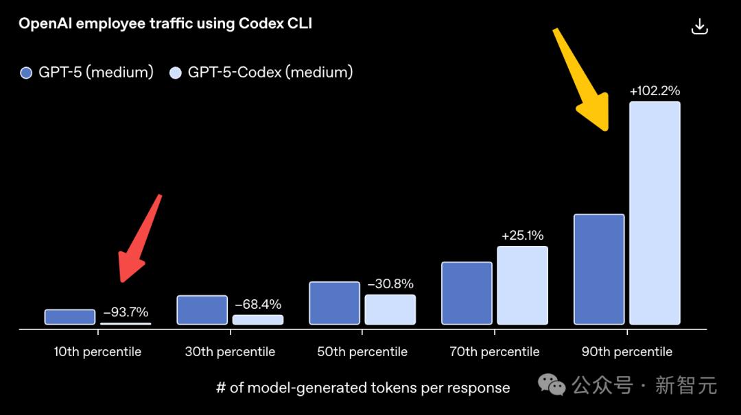 根据OpenAI内部员工的使用数据,在按模型生成token量(含隐藏推理和最终输出)排序的后10%用户请求中,GPT‑5-Codex的token消耗量比GPT‑5减少93.7%,红色箭头处。